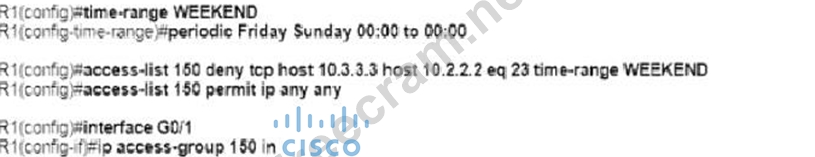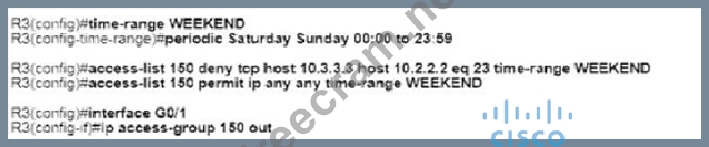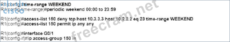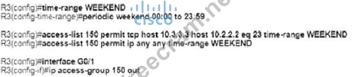 An engineer must deny Telnet traffic from the loopback interface of router R3 to the loopback interface of router R2 during the weekend hours. All other traffic between the loopback interfaces of routers R3 and R2 must be allowed at all times. Which command accomplish this task?
