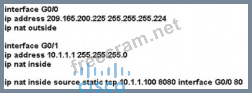 Refer to the exhibit. External users require HTTP connectivity to an internal company web server that is listening on TCP port 8080. Which command set accomplishes this requirement?
