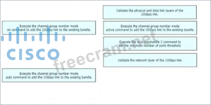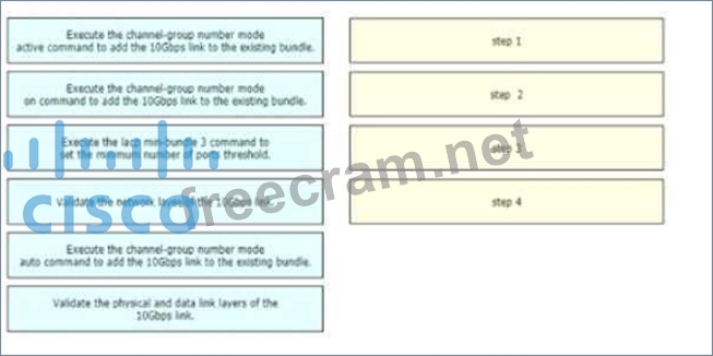 A network engineer is adding an additional 10Gps link to an exiting 2x10Gps LACP-based LAG to augment its capacity. Network standards require a bundle interface to be taken out of service if one of its member links goes down, and the new link must be added with minimal impact to the production network. Drag and drop the tasks that the engineer must perform from the left into the sequence on the right. Not all options are used.
