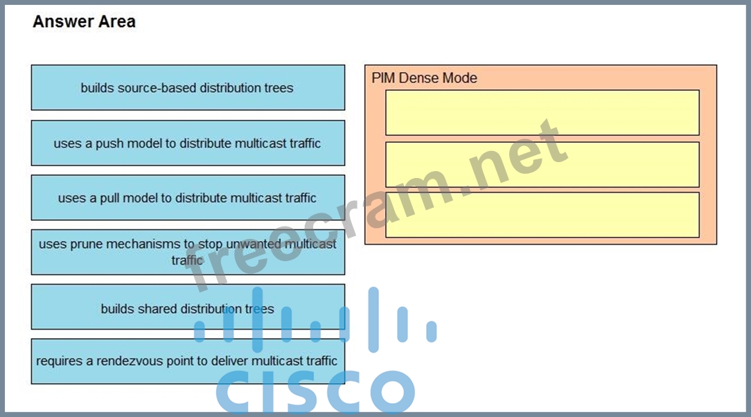 PIM dense mode (PIM-DM) uses a push model to flood multicast traffic to every corner of the network. This push model is a brute-force method of delivering data to the receivers. This method would be efficient in certain deployments in which there are active receivers on every subnet in the network. PIM-DM initially floods multicast traffic throughout the network. Routers that have no downstream neighbors prune the unwanted traffic. This process repeats every 3 minutes.