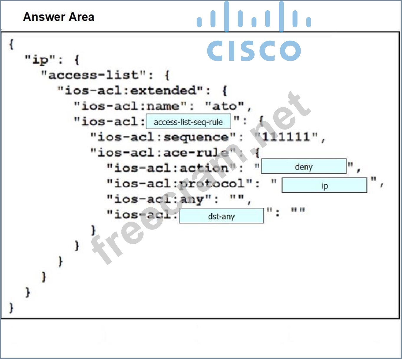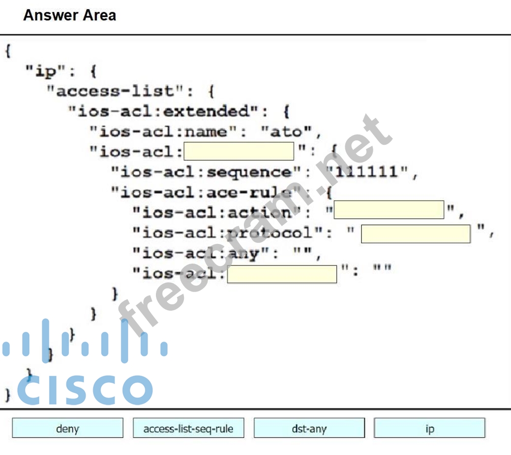 Drag and drop the code snippets from the bottom onto the blanks in the code to construct a request that configures a deny rule on an access list.