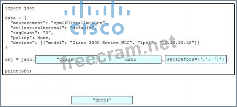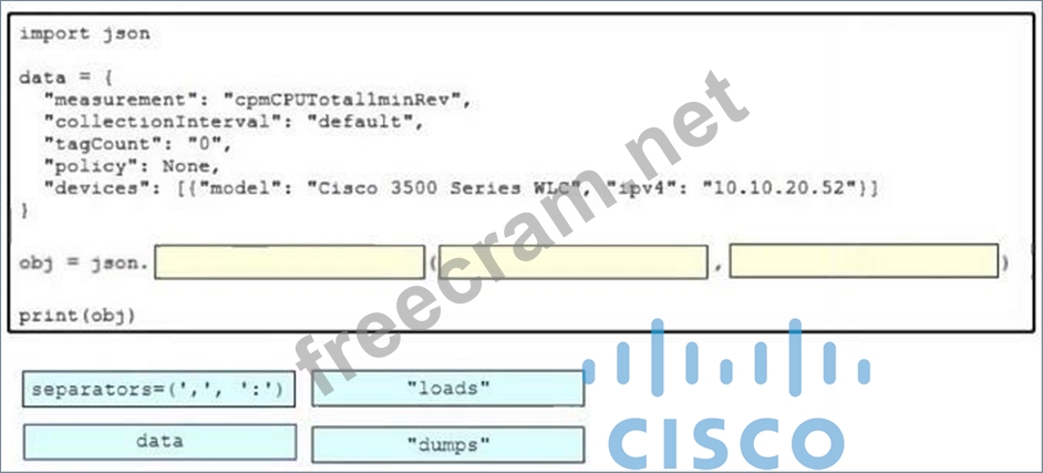 Drag and drop the code snippets from the bottom onto the blanks in the script to convert a Python object into a compact JSON object by removing space characters. Not all options are used.