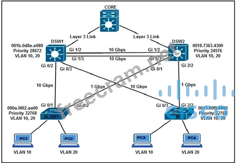 Which two commands ensure that traffic from PC1 is forwarded over Gi1/3 trunk port between DWS1 and DSW2? (Choose two)