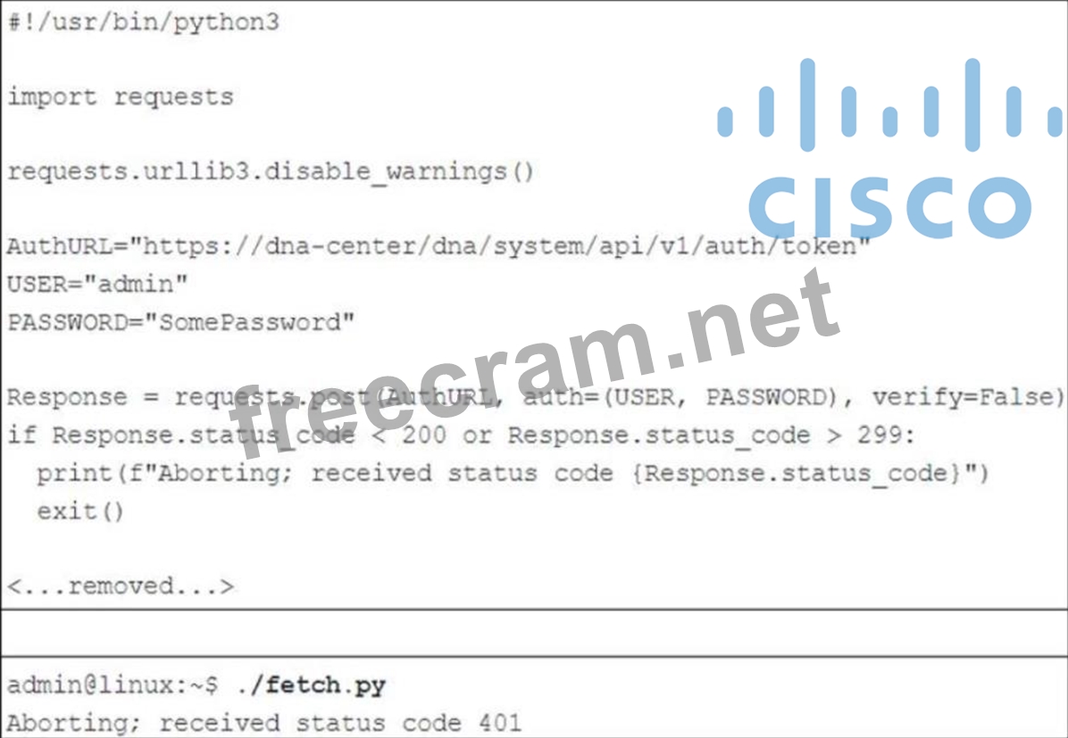Refer to the exhibit. An administrator writes a script to fetch the list of devices that are registered with Cisco DNA Center. Why does the execution abort?