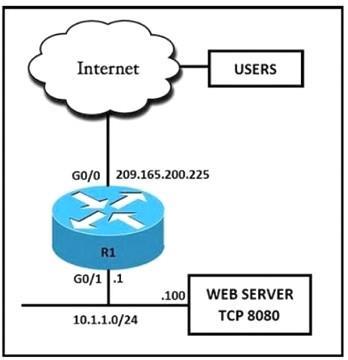 Refer to the exhibit. External users require HTTP connectivity to an internal company web server that is listening on TCP port 8080. Which command set accomplishes this requirement?