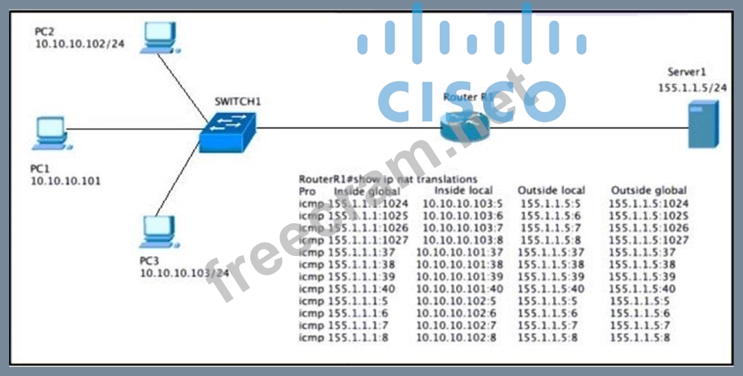 Refer to the exhibit. Hosts FC1, PC2; and PC3 must access resources on Server1. An engineer configures NAT on Router R1 to enable the communication and enters the show command to verify operation. Which IP address is used by the hosts when they communicate globally to Server1?