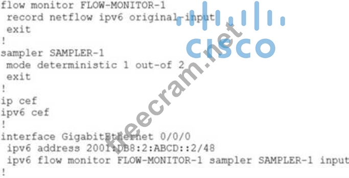 Refer to the exhibit. What is the effect of introducing the sampler feature into the Flexible NetFlow configuration on the router?