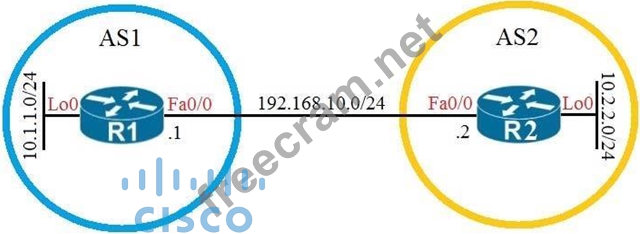 With BGP, we must advertise the correct network and subnet mask in the "network" command ( in this case network 10.1.1.0/24 on R1 and network 10.2.2.0/24 on R2). BGP is very strict in the routing advertisements. In other words, BGP only advertises the network which exists exactly in the routing table. In this case, if you put the command "network x.x.0.0 mask 255.255.0.0" or