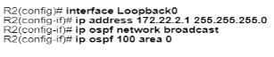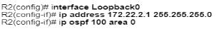 * Step 1. Create the loopback interface using the interface loopback number global configuration command. * Step 2. Add a description. Although optional, it is a necessary component for documenting a network. * Step 3. Configure the IP address. For example, the following commands configure a loopback interface of the R1 router shown in (shown earlier in the chapter): R1# configure terminal R1(config)# interface loopback 0 R1(config-if)# ip address 10.0.0.1 255.255.255.0 R1(config-if)# exit R1(config)#