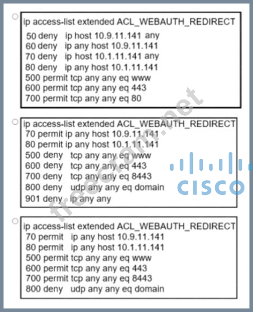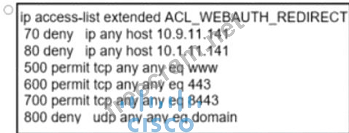 An engineer must construct an access list for a Cisco Catalyst 9800 Series WLC that will redirect wireless guest users to a splash page that is hosted on a Cisco ISE server The Cisco ISE servers are hosted at 10 9 11