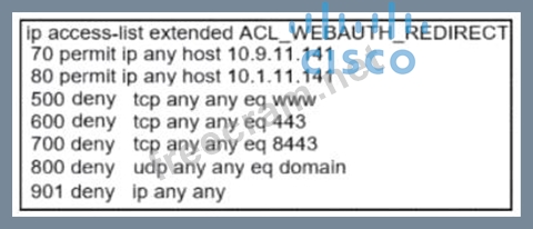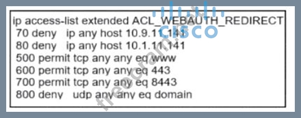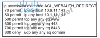 named ACL_WEBAUTH_REDIRECT and it allows any host to connect to the IP addresses 10.9.11.141 and 10.1.11.141 on port 80 and port 443: ip access-list extended ACL_WEBAUTH_REDIRECT and permit tcp any host 10.9.11.141 eq 80, permit tcp any host