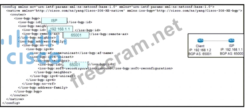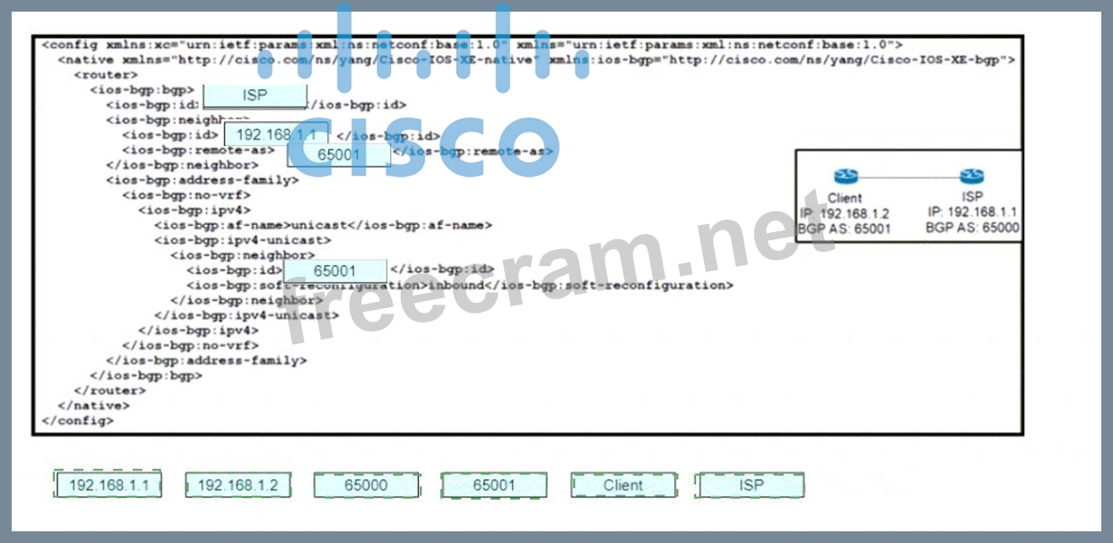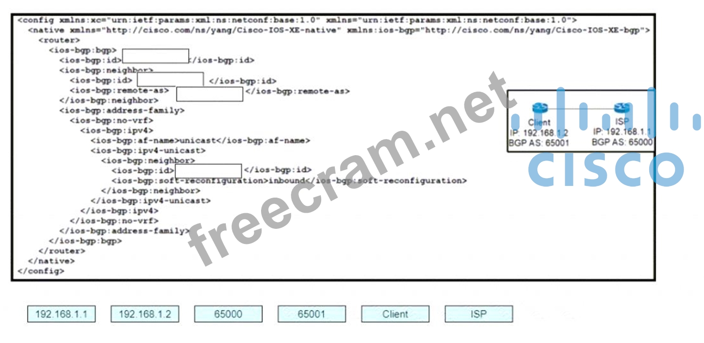 Drag and drop the snippets onto the blanks within the code to construct a script that configures BGP according to the topology. Not all options are used, and some options may be used twice.