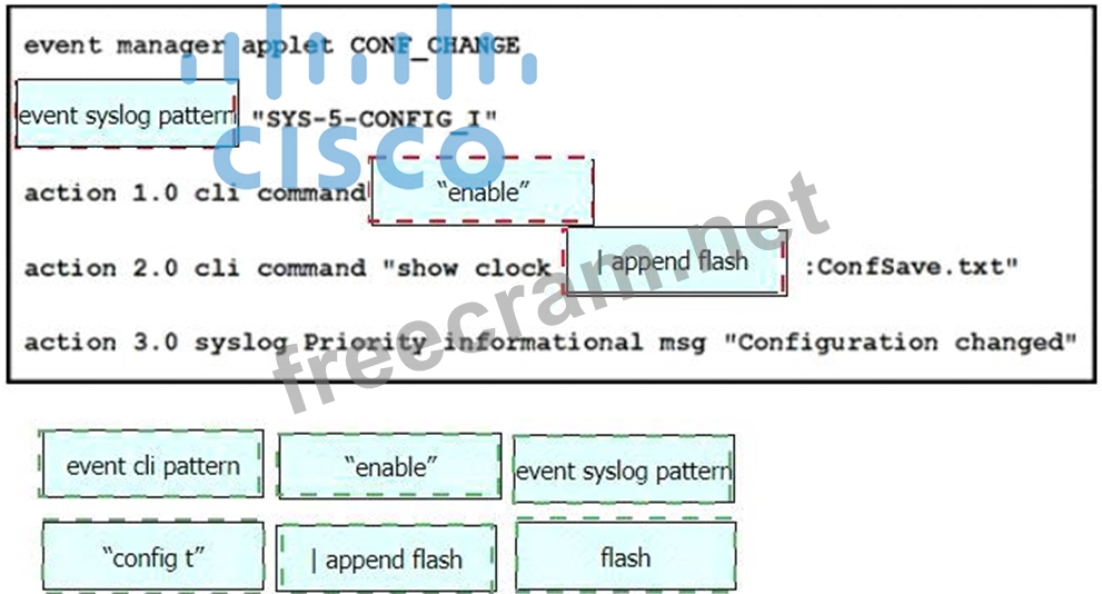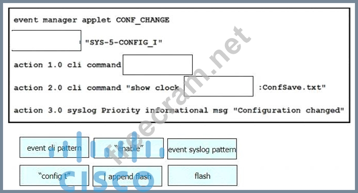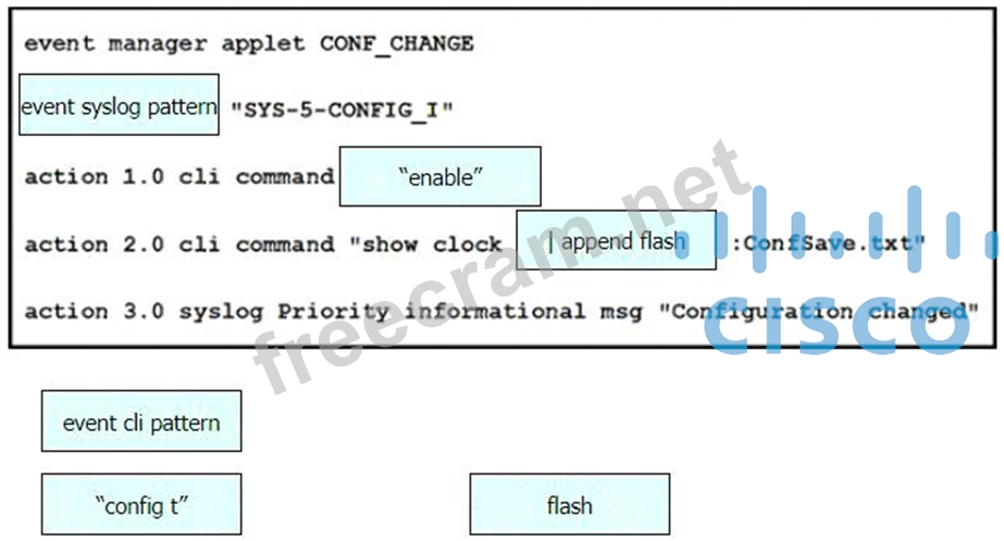 Drag and drop the snippets onto the blanks within the code to create an EEM script that adds an entry to a locally stored text file with a timestamp when a configuration change is made. Not all options are used.