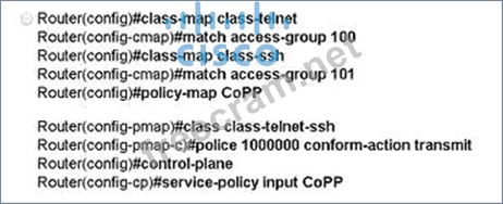 Refer to the exhibit. Which configuration set implements Control plane Policing for SSH and Telnet?