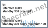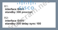 200 and R2 has a priority of 100, which means that R1 is the preferred active router and R2 is the standby router: standby 300 priority 200 on R1 and standby 300 priority 100 on R2.