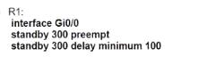 [minimum] <seconds>] command. Preemption allows a router with higher priority to take over the active role from a router with lower priority. Preemption delay is the time that a router waits before taking over the active role in the HSRP group. In this case, the preemption delay is 100 seconds, which means that R1 will wait for 100 seconds before preempting R2 after R1 regains operational status: standby 300 preempt delay minimum 100.