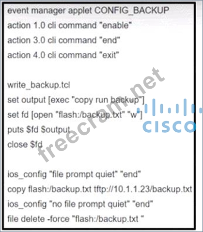 Which statement is needed to complete the EEM applet and use the Tel script to store the backup file?