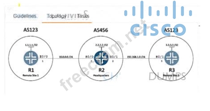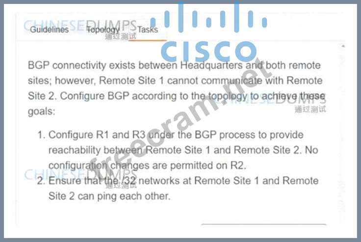 1. Configure R1 and R3 under the BGP process to provide reachability between Remote Site 1 and Remote Site 2. No configuration changes are permitted on R2.