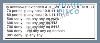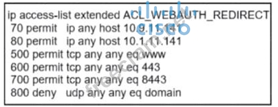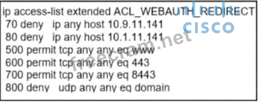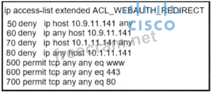 An engineer must construct an access list tot a Cisco Catalyst 9800 Series WLC that will -edirect wireless guest users to a splash page that is hosted on a Cisco ISE server. The Cisco ISE servers are hosted at 10.9.11.141 and 10.1.11.141. Which access list meets the requirements?