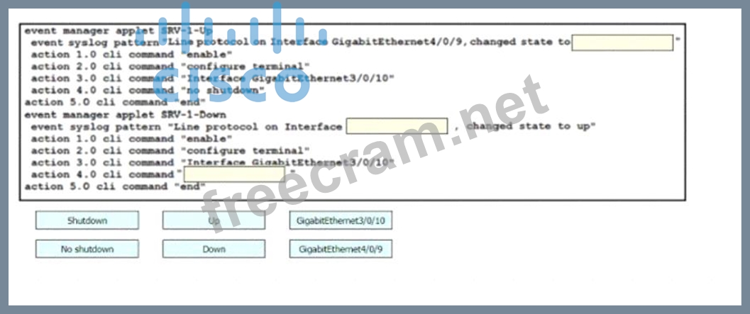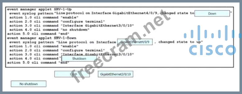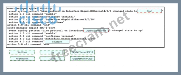 Drag and drop the snippets onto the blanks within the code to construct a script that brings up the failover Ethernet port if the primary port goes down and also shuts down the failover port when the primary returns to service. Not all options are used.