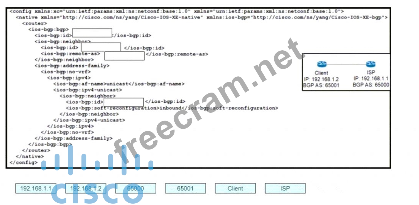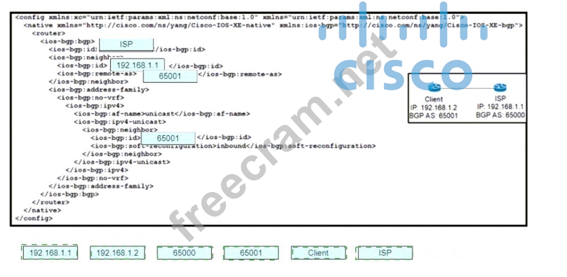 Drag and drop the snippets onto the blanks within the code to construct a script that configures BGP according to the topology. Not all options are used, and some options may be used twice.