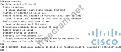 The logging message "HSRP-5-DUPADDR: Duplicate address 10.10.1.1 on FastEthernet0/0, sourced by 0000.0c07.ac02" indicates that there is another device on the network with the IP address that has been configured for HSRP group 50's virtual IP address (10.10.1.1). This could be a PC or any other device that has been assigned this IP address statically or dynamically, which conflicts with the HSRP virtual IP causing the error message. References: Implementing and Operating Cisco Service Provider Network Core Technologies (SPCOR) training materials would cover HSRP configuration and troubleshooting, including how to resolve issues related to duplicate IP addresses.
