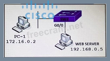 In Cisco routers, to allow traffic from a specific source to a specific destination on a particular port, the access control list (ACL) needs to specify the source IP address, the destination IP address, and the destination port number that needs to be accessed. Since PC-1 with IP address 172.16.0.2 is trying to access the web server on port 8080 at IP address 192.168.0.5, the ACL applied inbound on SW2's G0/0 interface should permit traffic from PC-1 to reach the web server's specific port. References: Implementing and Operating Cisco Service Provider Network Core Technologies (SPCOR) training materials.