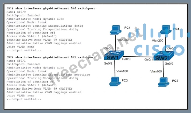 * Option D: Configuring 'switchport nonegotiate' on SW1 would disable Dynamic Trunking Protocol (DTP) negotiation messages. This should be done if you are setting one side of the connection (SW2) to a static trunk because DTP messages are unnecessary in this case.