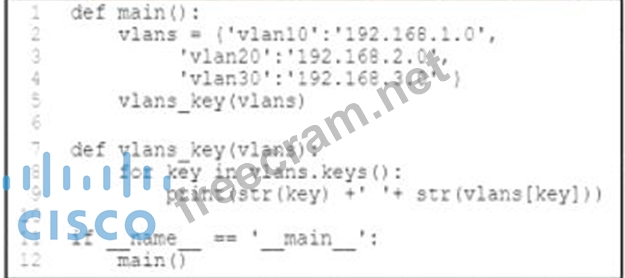 The script defines a dictionary of VLANs with their associated IP addresses and then prints each key-value pair from this dictionary. In Python, when you iterate over a dictionary using the .keys() method and print both key and value, it will be displayed as tuple type because it's printing two immutable elements together.