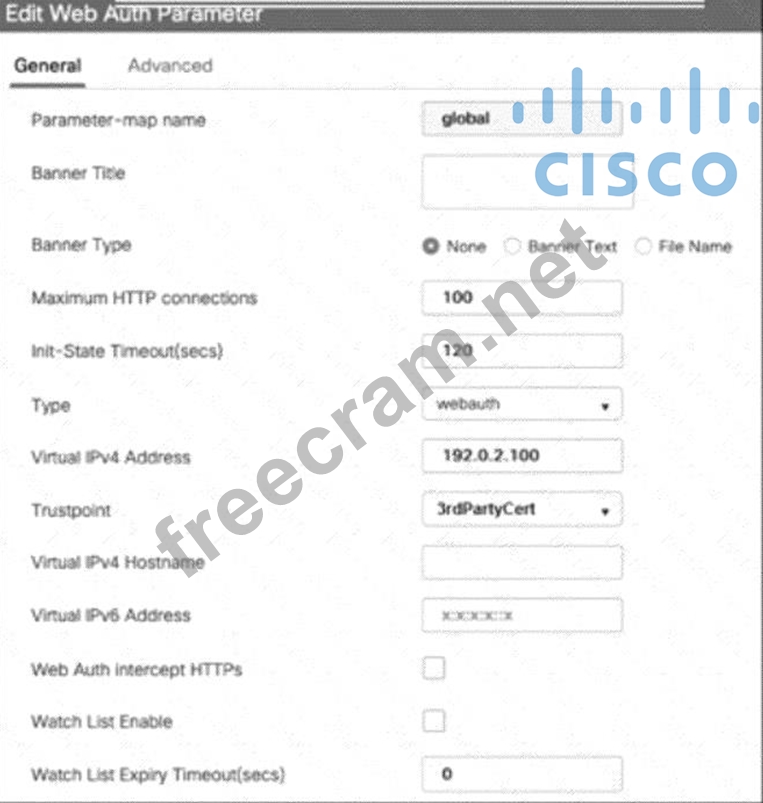 Reler to the exhibit. An engineer a configuring WebAuth on a Cisco Catalyst 9000 Series WIC. The engineer has purchased a third-party certificate using the FQDN of the WLC as the CN and intends to use bit on the WebAuth splash page What must be configured so that the clients do not receive a certificate error?