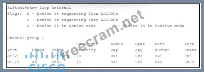 In the context of Cisco devices, when configuring a port channel with LACP (Link Aggregation Control Protocol), both ends of the port-channel must be set to compatible modes for the LACP bundle to form successfully. The exhibit shows that interface Gi0/1 is in an active state (SA flag), which means it is actively sending LACP packets. For Gi0/0 to join the bundle, it also needs to be set to either active or passive mode. Since we want it to function as expected and form a port-channel, setting it to 'active' will ensure that it sends LACP packets and attempts to negotiate with other LACP-enabled ports.