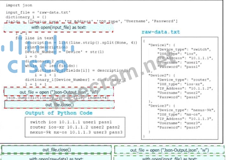 An engineer plans to use Python to convert text files that contain device information lo JSON. Drag and drop the code snippets from the bottom onto the blanks in the code to construct the request. Not all options are used.