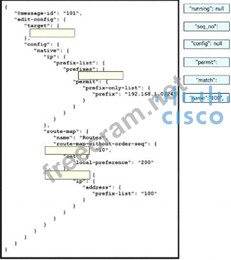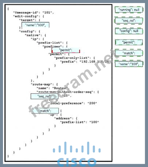 Dragand drop the snippets onto the blanks within the code toconstruct a script that adds a prefix list to a route map and sets the local preference. Not all options are used