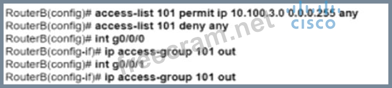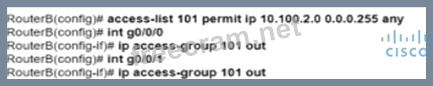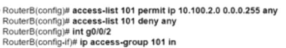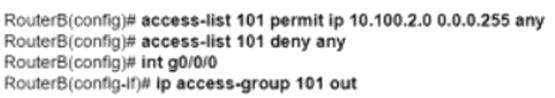 The configuration in Option D is correct because it uses an access list to permit traffic only from network 10.100.2.0 to networks outside of router B. The access list 101 is defined with a permit statement for IP traffic from the source network 10.100.2.0 with a wildcard mask of 0.0.0.255, allowing any destination ('any' keyword). This access list is then applied outbound on interfaces g0/0/0 and g0/0/1 using the 'ip access-group' command, effectively filtering traffic based on the defined criteria. References := Cisco Service Provider Network Core Technologies