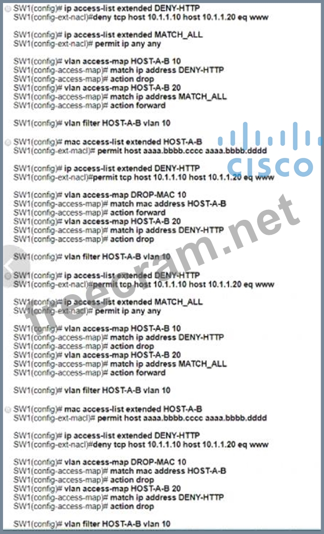 Refer to the exhibit. An engineer must deny HTTP traffic from host A to host B while allowing all other communication between the hosts. Which command set accomplishes this task?