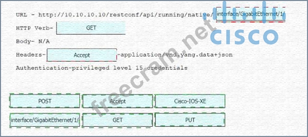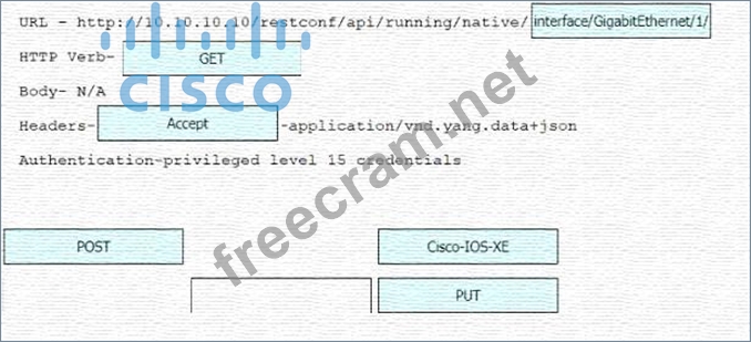 Refer to the exhibit Drag and drop the snippets into the RESTCONF request to form the request that returns this response Not all options are used