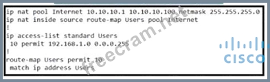 In the context of Cisco Service Provider Network Core Technologies, a dynamic continuous mapped NAT requires a pool of addresses that can be assigned to internal hosts as they initiate traffic towards the external network. The configuration shown in the exhibit indicates that there is a standard access list named 'Users' permitting the 192.168.1.0/24 network, which suggests that there are potentially up to 254 hosts (given the subnet mask of 255.255.255.0) that could require NAT translation at any given time. The current NAT pool 'Internet' has a range from 10.10.10.1 to 10.10.10.100 with a netmask of 255.255.255.0, which provides only 100 addresses for translation purposes. To ensure that there is an address available for each potential host on the inside network (192.168.1.0/24), we need to increase the size of this NAT pool so it can support up to 254 usable addresses (which is one less than the total number due to network and broadcast addresses being unusable). This will allow for each internal user to be dynamically mapped to an external address within this range when accessing resources outside their local network.