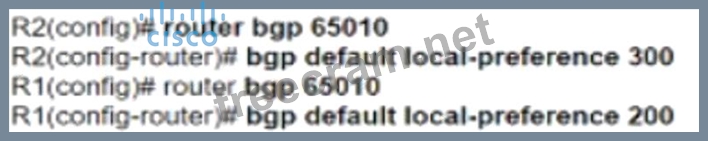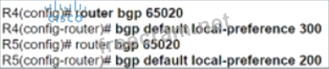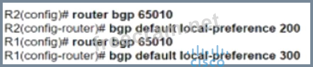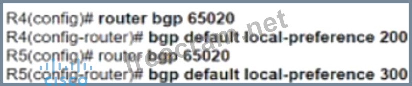 The configuration in option C is required to ensure that the preferred path for traffic from AS 65010 toward AS 65020 uses the R2 to R4 path. In BGP, the path with the highest local preference is preferred. The local preference attribute is a well-known discretionary attribute that is communicated within an autonomous system (AS). In this case, configuring R4 with a higher local preference ensures that it becomes the preferred path for outgoing traffic towards AS 65020. References := Implementing and Operating Cisco Service Provider Network Core Technologies