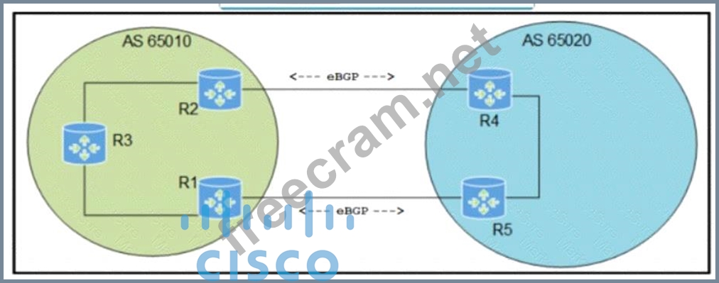 Refer to the exhibit. Which configuration must be applied to ensure that the preferred path for traffic from AS 65010 toward AS 65020 uses the R2 to R4 path?