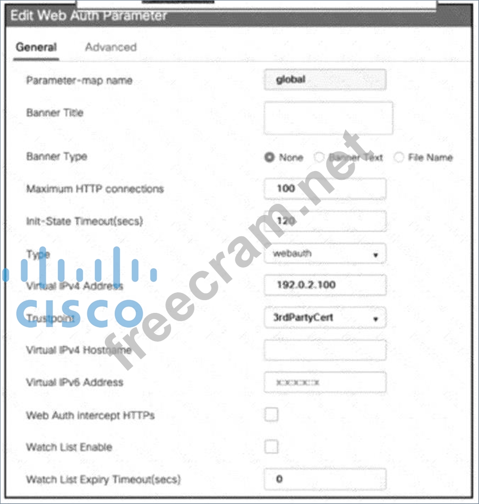 Reler to the exhibit. An engineer a configuring WebAuth on a Cisco Catalyst 9000 Series WIC. The engineer has purchased a third-party certificate using the FQDN of the WLC as the CN and intends to use bit on the WebAuth splash page What must be configured so that the clients do not receive a certificate error?