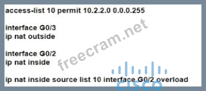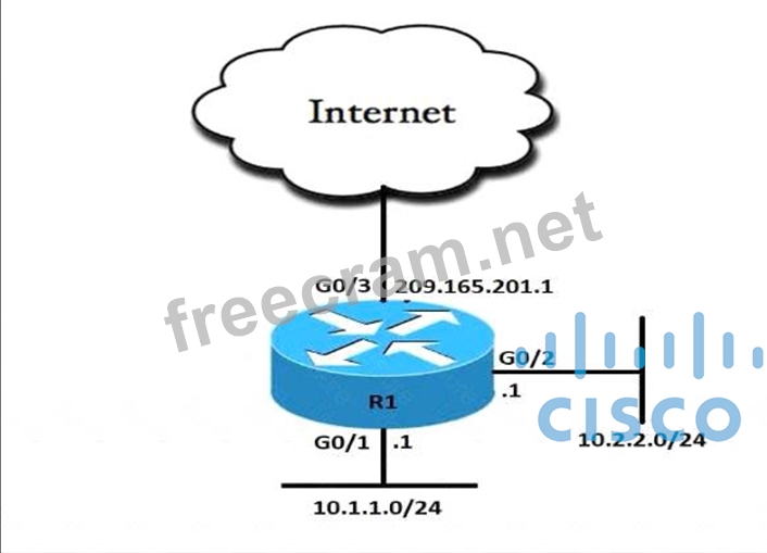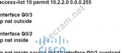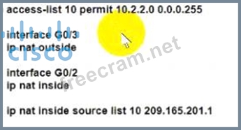 An engineer must allow all users in the 10.2.2.0/24 subnet to access the Internet. To conserve address space the public Interface address of 209 165 201.1 must be usedfor all external communication. Which command set accomplishes these requirements?