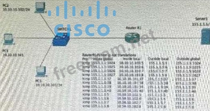 Refer to the exhibit. Hosts PC1 PC2 and PC3 must access resources on Serve 1. An engineer configures NAT on Router R1 1e enable the communication and enters the show command to verify operation Which IP address is used by the hosts when they communicate globally to Server1?