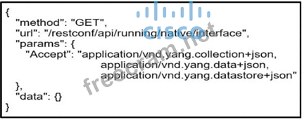 The API request shown in the exhibit is a GET method call to the RESTCONF API endpoint "/restconf/api/running/native/interface". This type of request is used to retrieve information, and in this case, it is specifically for obtaining details about the native interfaces on a network appliance that are part of the running configuration. The "params" with "Accept" headers indicate the expected format of the response data, which includes YANG data models in JSON format. Since it's a GET request, no data is being sent to the network appliance; instead, the request is for reading data from it. References: * Implementing and Operating Cisco Service Provider Network Core Technologies (SPCOR) training materials provide in-depth explanations on RESTCONF API calls and their usage in managing Cisco devices. * The Cisco Learning Network Store offers resources such as on-demand e-learning for the SPCOR course, which can be found here. * Additional information on Cisco Service Provider certifications and training can be accessed here.