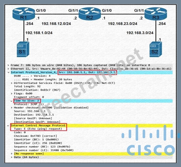 Which troubleshooting a routing issue, an engineer issues a ping from S1 to S2. When two actions from the initial value of the TTL? (Choose two.)