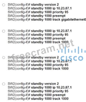 The HSRP configuration for VLAN 1000 on SW2 requires setting up the switch to take over as the active router immediately if the interlink with the primary switch fails. The command set in Option C is the appropriate choice because it includes the standby 1000 priority command with a higher priority value to become the active router, and the standby 1000 preempt command to enable the switch to take over if the primary fails. Additionally, the standby 1000 track command is used to monitor the interface's status and decrement the priority if the interface goes down, ensuring a swift failover.