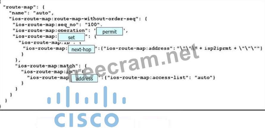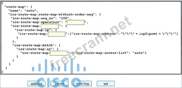 Drag and drop the code snippets from the bottom onto the blanks in the code to construct a request that configures policy-based routing.