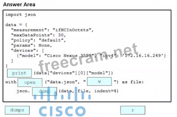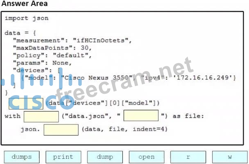 Drag and drop the code snippets from the bottom onto the blanks in the Python script to print the device model to the screen and write JSON data to a file. Not all options are used.