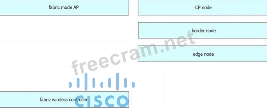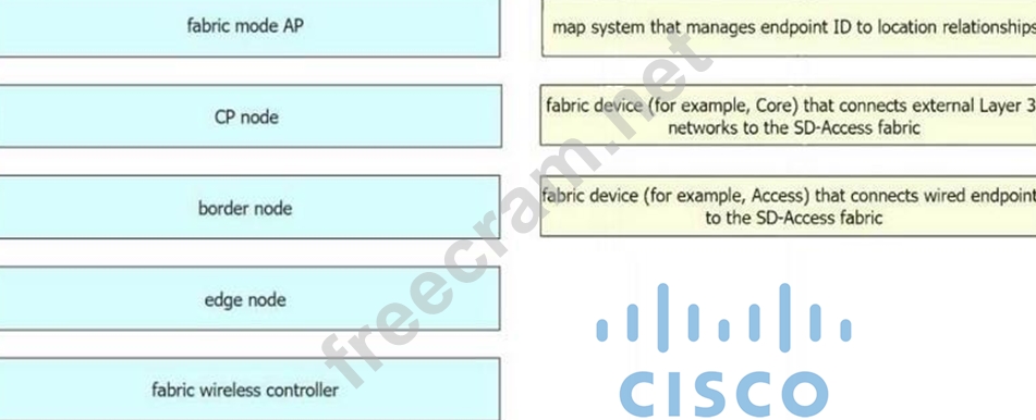 Drag and drop the components of the Cisco SD-Access fabric architecture from the left onto the correct descriptions on the right. Not all options are used.
