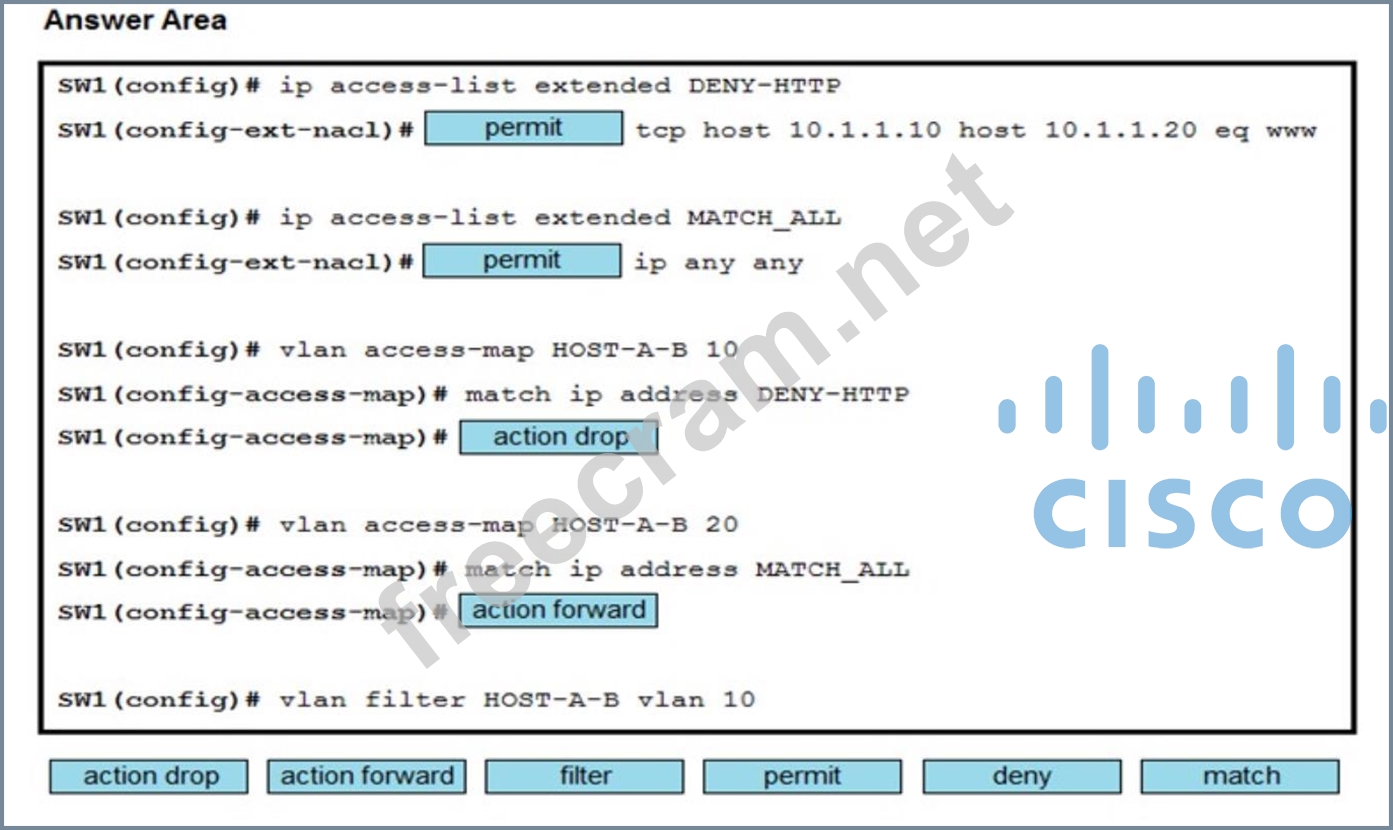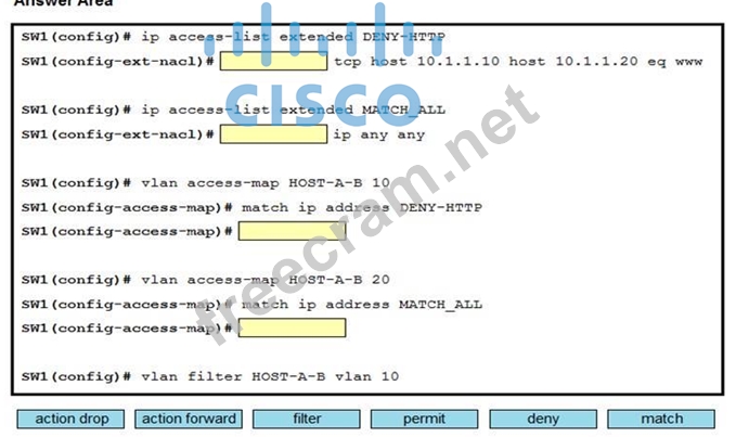 Refer to the exhibit. An engineer must deny HTTP traffic from host A to host B while allowing all other communication between the hosts. Drag and drop the commands into the configuration to achieve these results. Some commands may be used more than once. Not all commands are used.