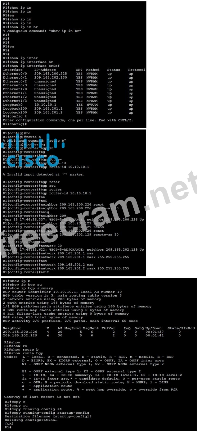 2. Advertise R1's Loopback 100 and Loopback 200 networks to AS20 and AS30.